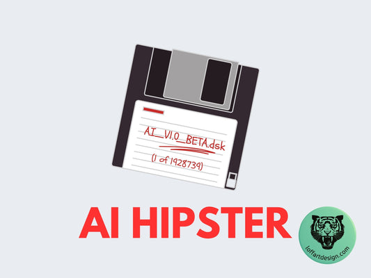• T-shirt design featuring a vintage floppy disk labeled ‘AI_V1.0_BETA.dsk’ with the text ‘AI Hipster’—a playful mix of retro tech and AI humo