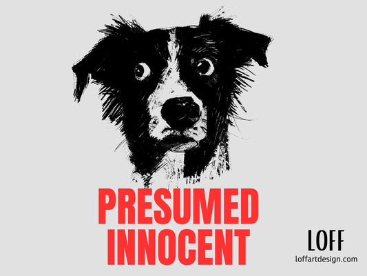 • Illustration of a dog with the text “Presumed Innocent” in bold red letters, printed on a high-quality t-shirt