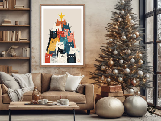 Christmas Cat Tree Poster | Festive Cat Art Print